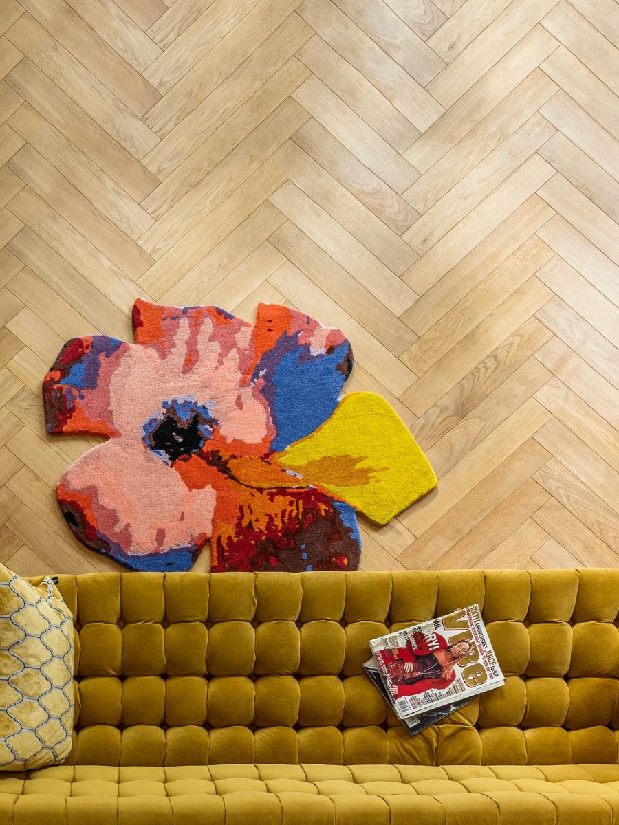 Hand tufted rug featuring original artwork by Teebs, an electronic musician and painter whose collaging of both sound and images are textured, colourful and tranquil. Curves has collaborated with Teebs on this homeware collection consisting of rugs, a shower curtain, and bedding set.