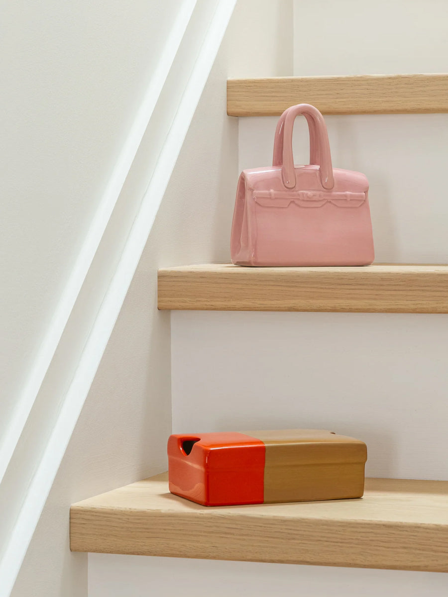 A ceramic update of the shoe boxes stacked in your closet. An accent piece and a reminder to spend some and stash the rest. Each piece is hand painted, finishings may have slight variations.